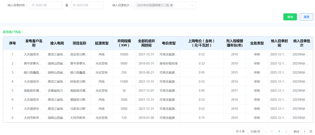 储能头条获悉,12月15日,国家电网有限公司在新能源云官网发布《关于公布2025年第十二批可再生能源发电补贴项目清单的报告》,对通过国网新能源云平台申报纳入可再生能源发电补贴清单,经国家电网初审、省级主管部门确认、国家可再生能源信息管理中心复核后,按规定完成公示程序的项目予以公布。