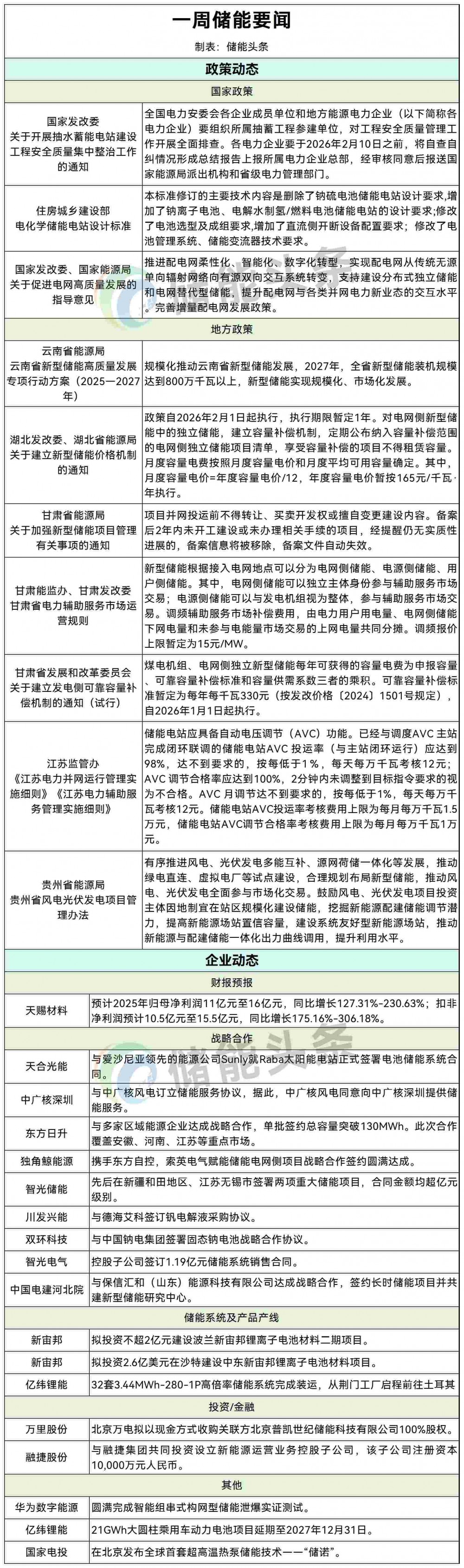 1月4日,湖北省发展改革委、湖北省能源局发布《关于建立新型储能价格机制的通知》,政策自2026年2月1日起执行,执行期限暂定1年。对电网侧新型储能中的独立储能,建立容量补偿机制,定期公布纳入容量补偿范围的电网侧独立储能项目清单,享受容量补偿的项目不得租赁容量。月度容量电费按照月度容量电价和月度平均可用容量确定。其中,月度容量电价=年度容量电价/12,年度容量电价暂按165元/千瓦·年执行。(来源:湖北省发展和改革委员会)