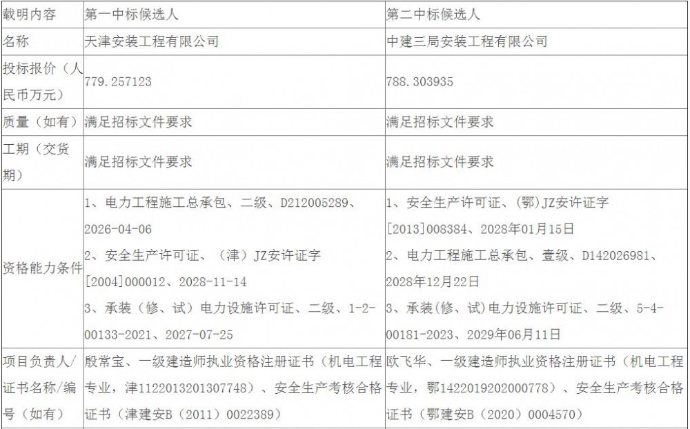 第一中标候选人为天津安装工程有限公司,投标报价779.257123万元;第二中标候选人为中建三局安装工程有限公司,投标报价788.303935万元。
