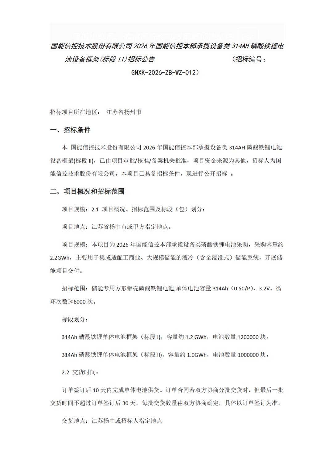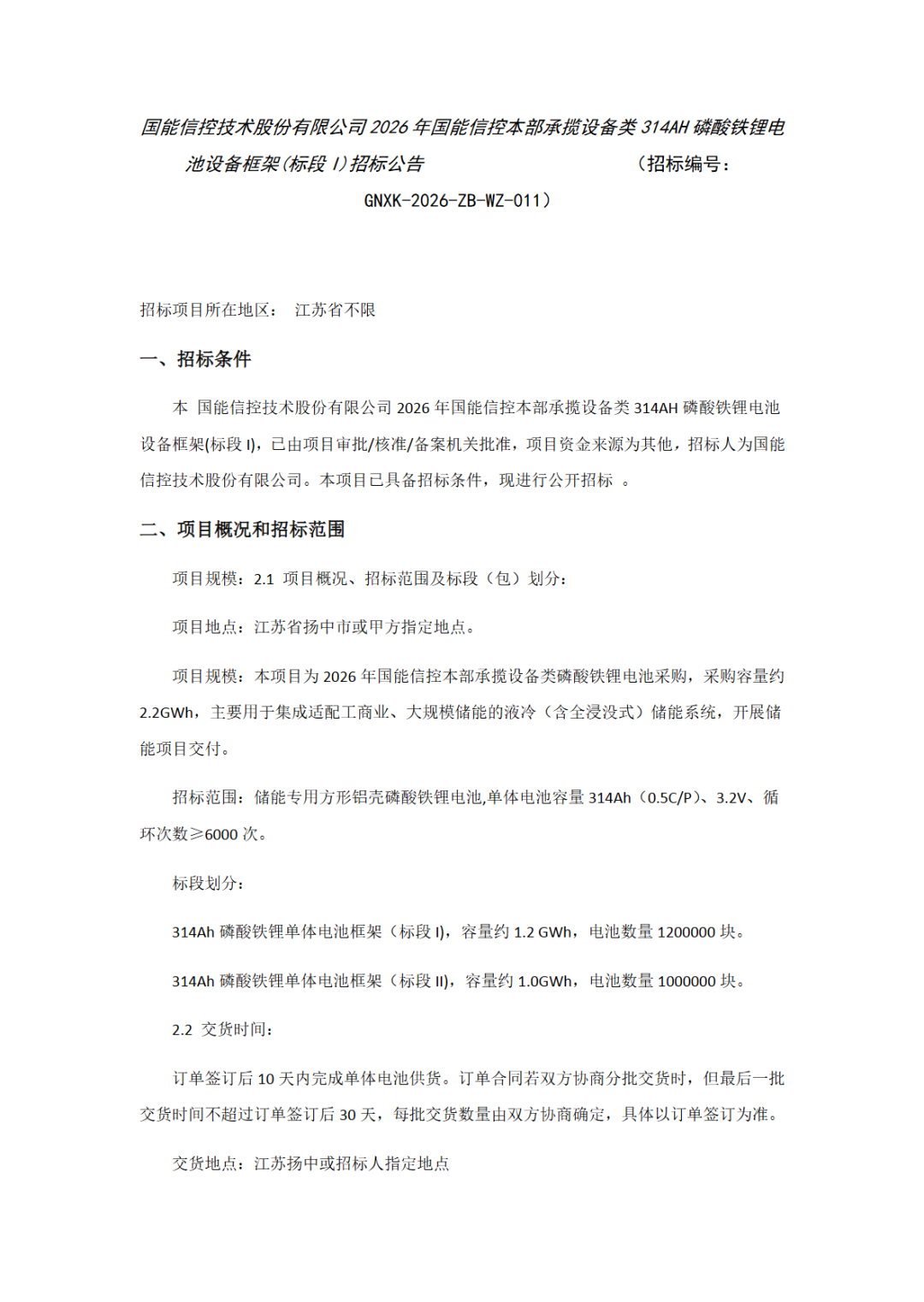 储能头条获悉,1月9日,国能信控技术股份有限公司2026年国能信控本部承揽设备类314Ah磷酸铁锂电池设备框架招标公告发布。两个标段共采购314Ah电芯220万块,总容量约2.2GWh。