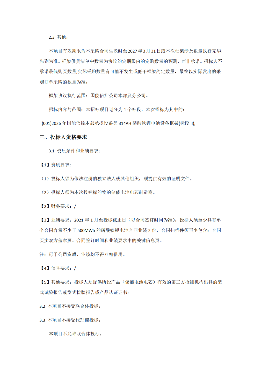 投标人业绩要求:2021年1月至投标截止日(以合同签订时间为准),投标人须至少具有单个合同容量不少于500MWh的磷酸铁锂电池合同业绩2份。