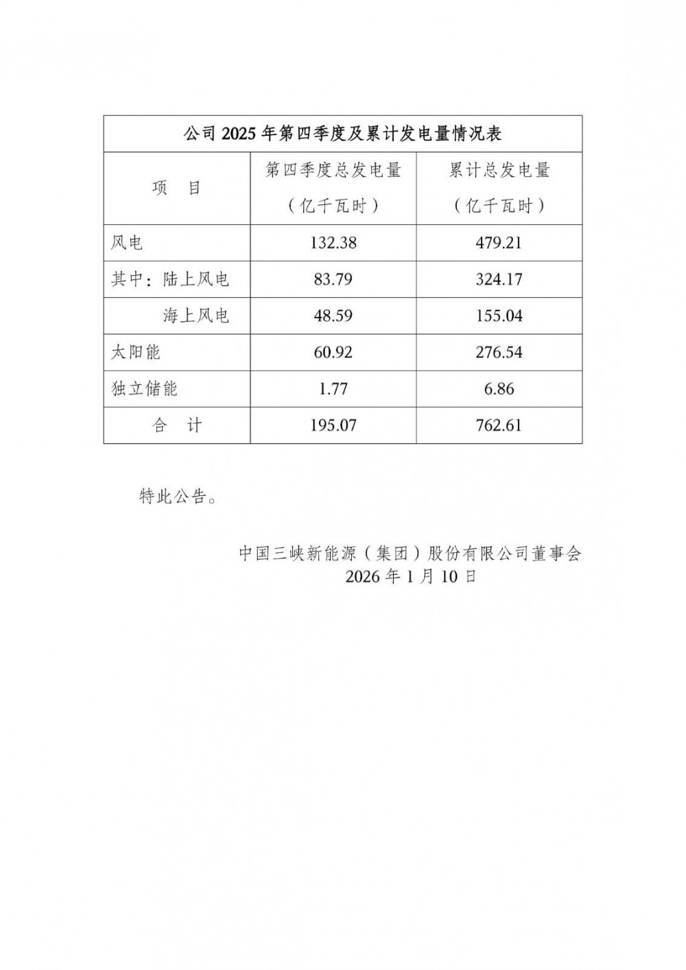 公告显示,截至2025年12月31日,三峡能源2025年第四季度总发电量195.07亿千瓦时,较上年同期增长0.92%。其中,风电完成发电量132.38亿千瓦时,较上年同期增长2.33%(陆上风电完成发电量83.79亿千瓦时,较上年同期增长5.09%;海上风电完成发电量48.59亿千瓦时,较上年同期下降2.12%);太阳能完成发电量60.92亿千瓦时,较上年同期增长1.70%;独立储能完成发电量1.77亿千瓦时,较上年同期下降13.24%。